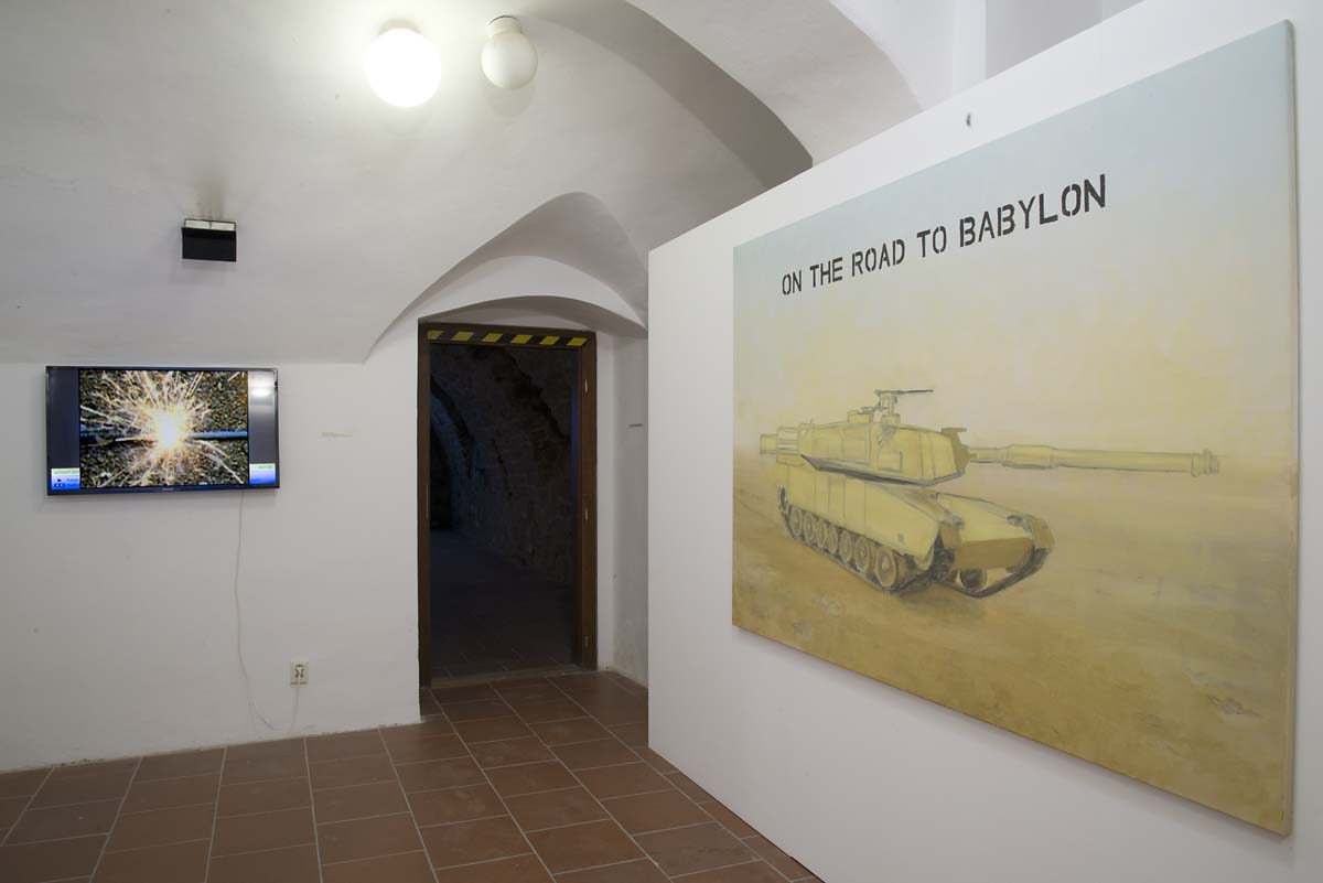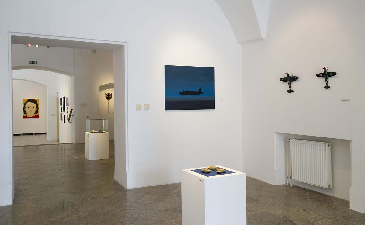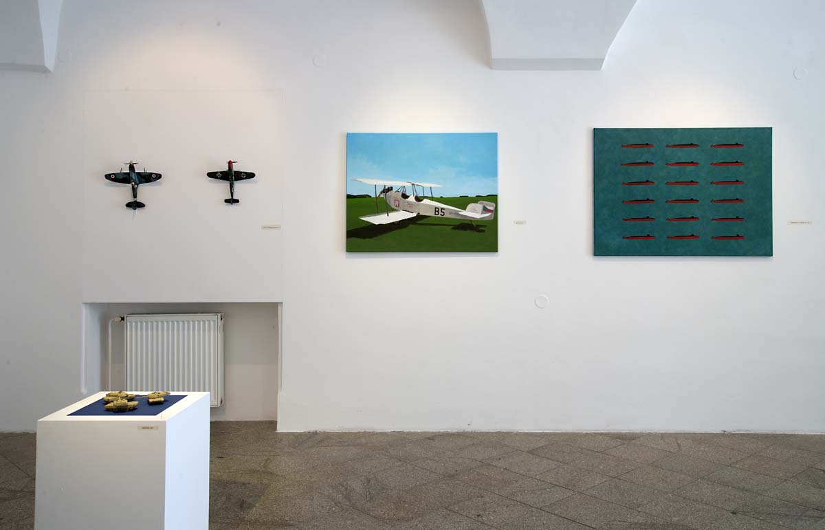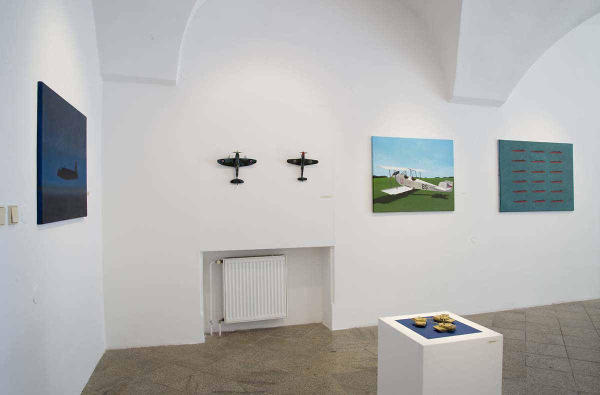 Na výstavě v plzeňské galerii představí výběr z několika cyklů, na kterých tématicky pracuje několik let. K těm nejstarším patří obrazy ze souboru Krajina, která může explodovat, kde na monochromně namalované plátno použil jednoduché piktogramy moderních a současných zbraní (gripeny, tanky apod.), jež mají jednak symbolizovat historickou zkušenost, ale i vybavenost současného světa stále připravenou vojenskou technikou. Naopak s aktivní silou pracuje ve svých komorních akcích, kdy na klasicky připravené a monochromě podmalované plátno aplikuje řízenou kresbu pomocí zápalné šňůry a střelného prachu. Vzniklé „pyroobrazy“, přestože jsou malovány výbušninou, působí překvapivě krásně a poeticky. Na výstavě je zastoupen i jeden z obrazů z cyklu Čápy, kde autor volně pracuje se symbolem slavné francouzské stíhací eskadry z I. světové války, jenž byl inspirací pro znak 312. československé stíhací perutě za II. světové války v Anglii, a který francouzské letectvo používá dodnes. Umělec pracuje i se symbolikou nacistickou, ale její význam používá v jiných souvislostech, tak jako v případě díla 18. fašistů Karla M. Kuttelwaschera. Na monochromní tmavě šedou plochu obrazu malého formátu namaloval ve dvou řadách osmnáct hákových křížů, které symbolizují počet německých letadel, jež český pilot sestřelil při válečných operacích. Vlček tak zopakoval způsob, jímž si české eso britského královského letectva zaznamenávalo počet sestřelených letadel pod kabinu svého stroje. K tomuto cyklu lze přiřadit i drobné portréty válečných hrdinů, kterým dominuje obraz s podobiznou Ireny Bernáškové. Bernášková byla novinářkou a první českou ženou popravenou za odboj proti fašismu. Na výstavě je třemi menšími obrazy zastoupen i cyklus věnovaný legendární postavě fiktivního hrdiny Péráka, který za protektorátu bojoval proti německým okupantům a kolaborantům, škodil německému válečnému hospodářství a strašil lidi. Výstavu Vlček doplňuje svojí rozsáhlou časosběrnou fotodokumentací svých aktivit, které provozuje v rámci historického re-enactmentu, drobnými autorskými objekty a svou sbírkou válečných vyznamenání a dobových předmětů, jež prezentuje jako ready-made objekty ve své neporušené autentické podobě.
